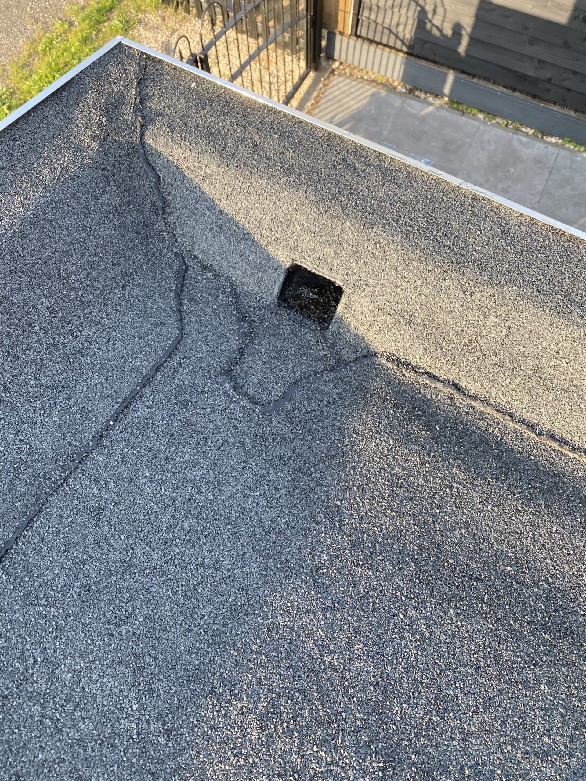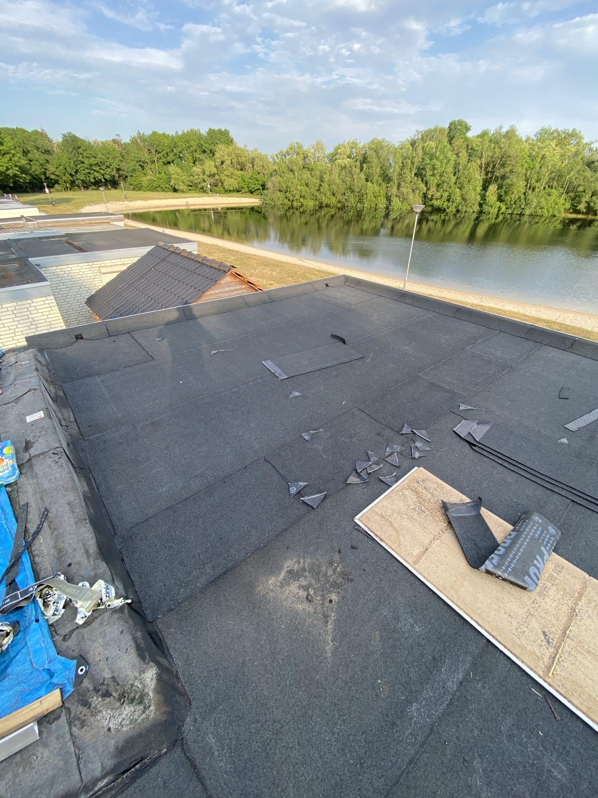 Het oude bitumendak had zijn beste tijd gehad. Deze is overlaagd met een nieuwe bitumen toplaag met minerale afwerking voor een lange levensduur. De dakranden zijn volledig vernieuwd en afgewerkt met een aluminium daktrim.
