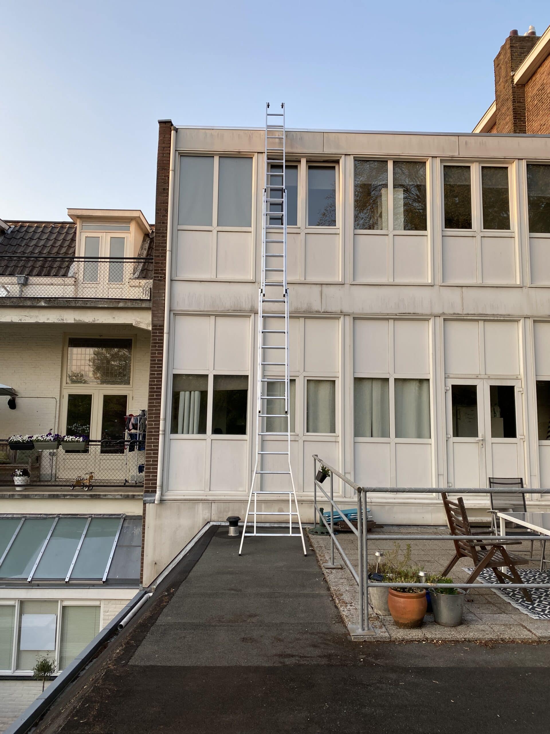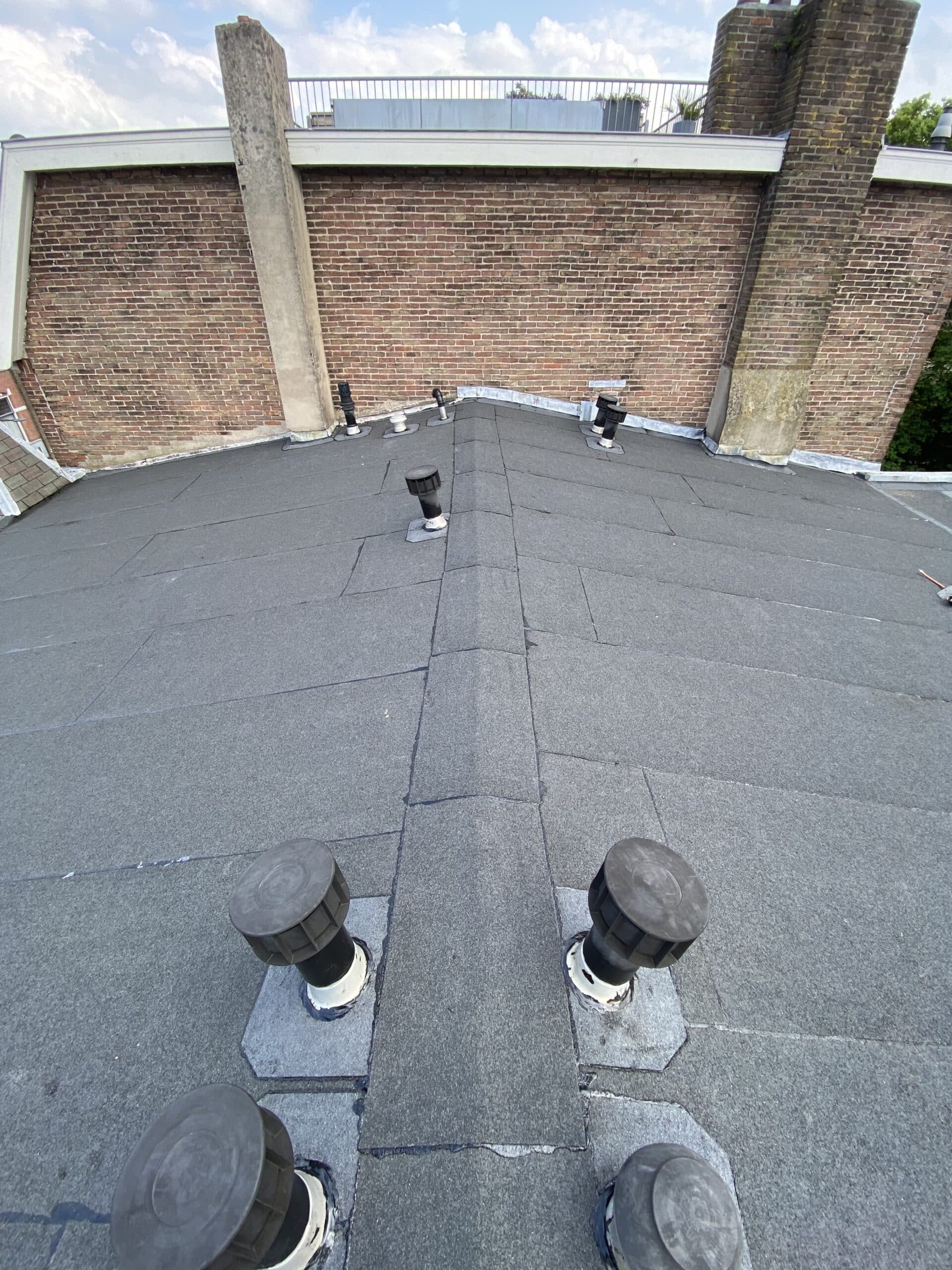 Het hellende bitumendak van een appartementencomplex was toe aan een volledige dakrenovatie. Naast de vernieuwde toplaag is het lood tegen de gevel vervangen en alle ontluchtingen vernieuwd.